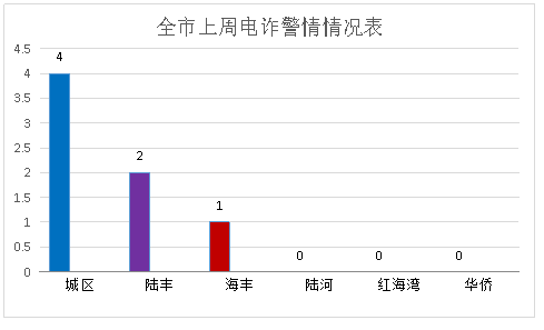 上周電詐警情中,城區(qū)警情發(fā)生在風(fēng)山街道和紅草鎮(zhèn);海豐警情發(fā)生在梅隴鎮(zhèn);陸豐警情發(fā)生在東海街道和城東街道;電詐警情發(fā)生較多的鎮(zhèn)街是鳳山街道,為3起。