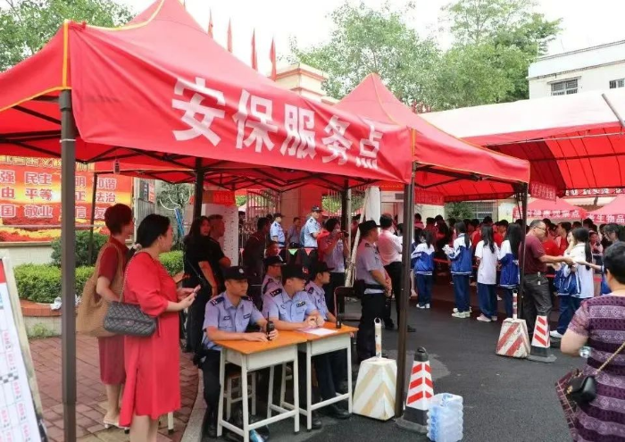 按照“一考點(diǎn)一服務(wù)站”要求,考試期間在全市17考點(diǎn)設(shè)立安保服務(wù)站23個,現(xiàn)場受理、快速處置涉考警情求助,為有需要的考生提供應(yīng)急服務(wù)??荚嚻陂g,每日派出約900人警力分別駐扎在全市17個高考考點(diǎn)及考點(diǎn)周邊。