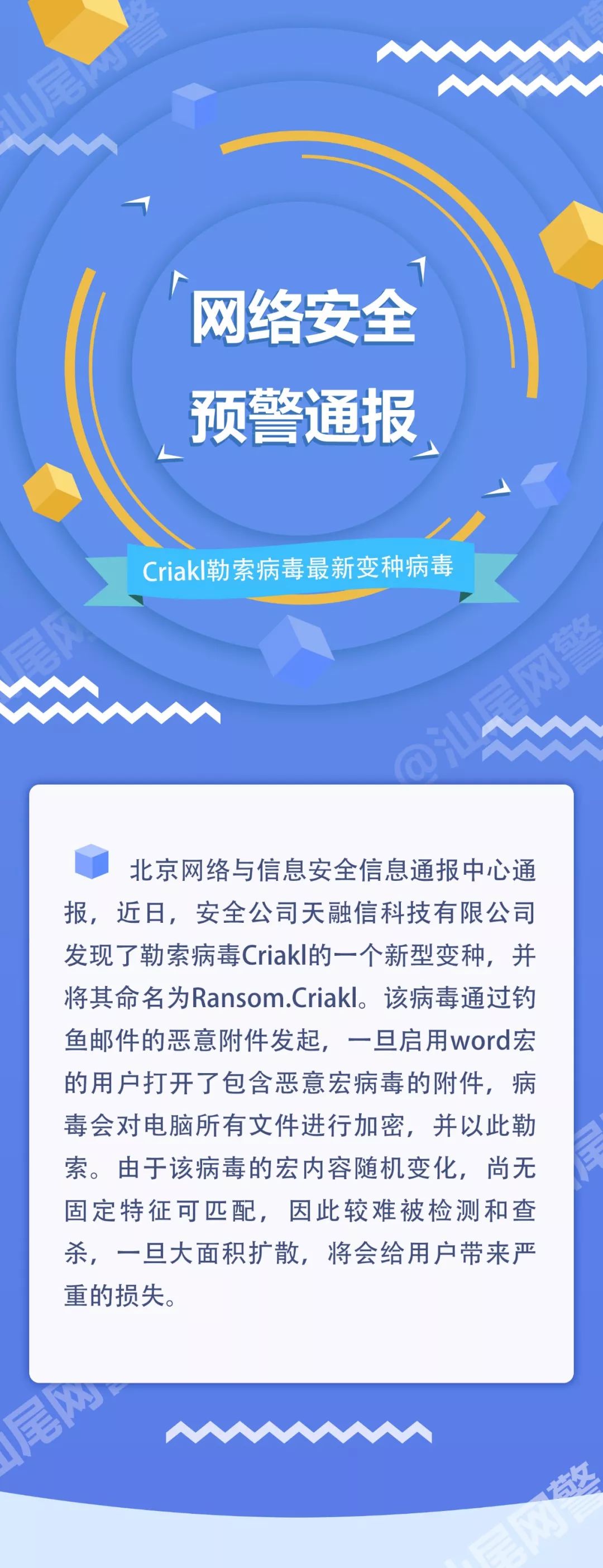 網(wǎng)絡(luò)安全預(yù)警通報(bào)丨關(guān)于Criakl勒索病毒最新變種病毒的預(yù)警通報(bào)