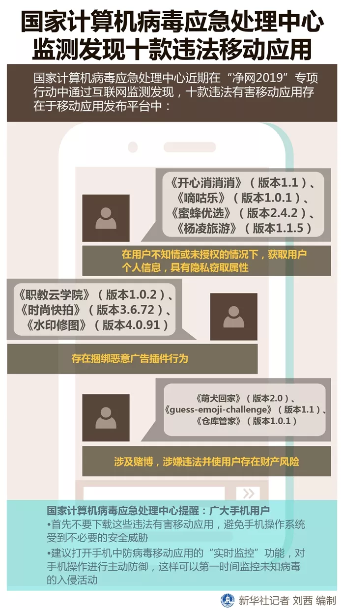 國(guó)家計(jì)算機(jī)病毒應(yīng)急處理中心近期在“凈網(wǎng)2019”專(zhuān)項(xiàng)行動(dòng)中,通過(guò)互聯(lián)網(wǎng)監(jiān)測(cè)發(fā)現(xiàn),十款違法有害移動(dòng)應(yīng)用存在于移動(dòng)應(yīng)用發(fā)布平臺(tái)中,其主要危害涉及隱私竊取、私自下載和賭博三類(lèi)。