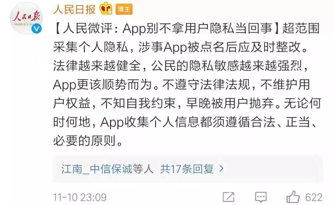 對(duì)此,人民日?qǐng)?bào)官方微博也發(fā)表了人民微評(píng):App別拿用戶隱私不當(dāng)回事!