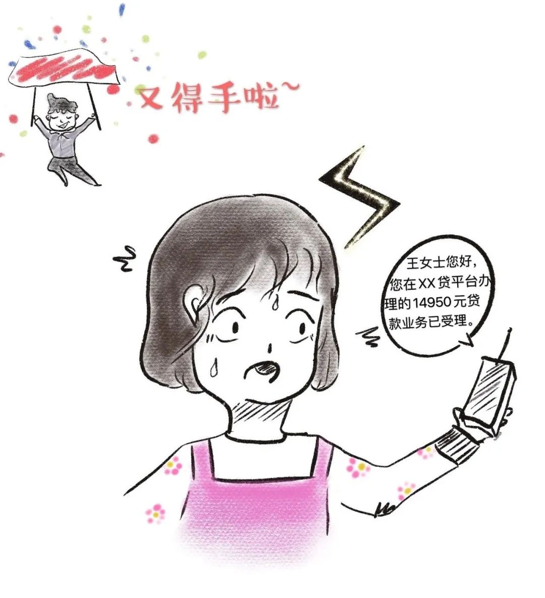 成功轉(zhuǎn)賬后,王女士以為沒(méi)事了。滴滴滴,短信怎么又響了?什么?!怎么會(huì)收到一條辦理貸款業(yè)務(wù)的短信?短信顯示王女士剛剛在XX貸平臺(tái)辦理了一筆14950元的貸款業(yè)務(wù)。