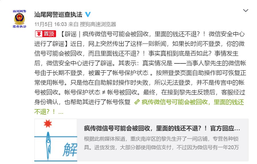 辟謠|瘋傳微信號可能會被回收,里面的錢還不退?!微信安全中心進行了辟謠!