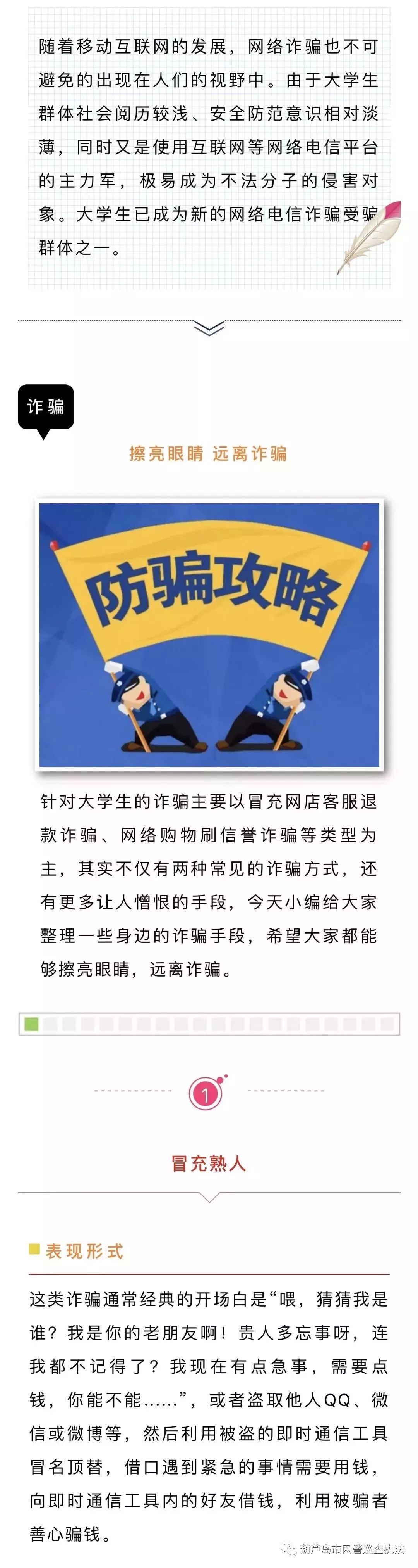 隨著移動互聯(lián)網(wǎng)的發(fā)展,網(wǎng)絡詐騙也不可避免的出現(xiàn)在人們的視野中。由于大學生群體社會閱歷較淺、安全防范意識相對淡薄,同時又是使用互聯(lián)網(wǎng)等網(wǎng)絡電信平臺的主力軍,極易成為不法分子的侵害對象。大學生已成為新的網(wǎng)絡電信詐騙受騙群體之一。我們?yōu)榇蠹艺砹藘牲c防詐騙小知識,希望大家能夠認真閱讀哦。