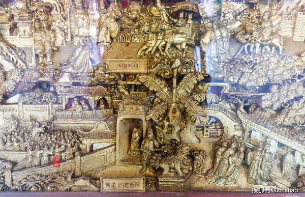鳳山祖廟的雕塑非常有意思,比如這個金漆木雕就涵蓋了很多的小故事。人物、場景,無一不是細致入微。細細看來,一個故事壓著一個故事,卻一點不顯凌亂。