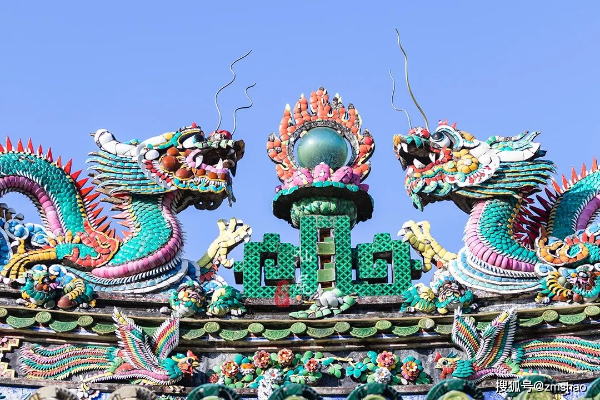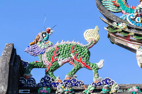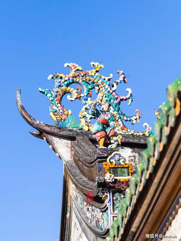 感覺潮汕和福建一帶的建筑風格還是比較近似的,這屋脊上的剪瓷雕裝飾,異常華美。雙龍戲珠,僅僅龍頭就有很多不同的顏色,更別提滿身的龍鱗了。