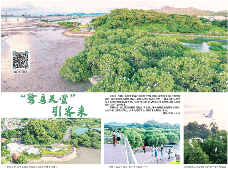 近年來,市城區(qū)各級黨委政府牢固樹立“綠水青山就是金山銀山”的發(fā)展理念,大力推動生態(tài)文明建設。在城區(qū)馬宮街道長沙村,一處茂密的紅樹林成了水鳥的棲息地,被當?shù)厝朔Q為“鷺鳥天堂”,優(yōu)質的生態(tài)環(huán)境讓鷺鳥天堂里的“住戶”越來越多。