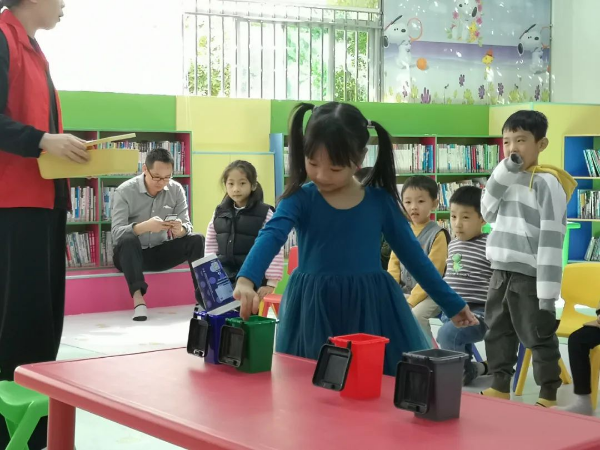 活動(dòng)中,志愿者老師為孩子們耐心講解什么是可回收垃圾,什么是有害垃圾,什么是廚余垃圾和其他垃圾,并通過PPT向孩子們展示了有趣易懂的垃圾分類方法,教授垃圾分類兒歌。志愿者老師還與孩子們進(jìn)行了垃圾分類趣味小游戲,現(xiàn)場(chǎng)氣氛活躍,孩子們積極爭(zhēng)取搶答機(jī)會(huì),將教學(xué)道具投入到對(duì)應(yīng)的分類垃圾桶中,在游戲互動(dòng)中學(xué)習(xí)垃圾分類的方法和技巧。