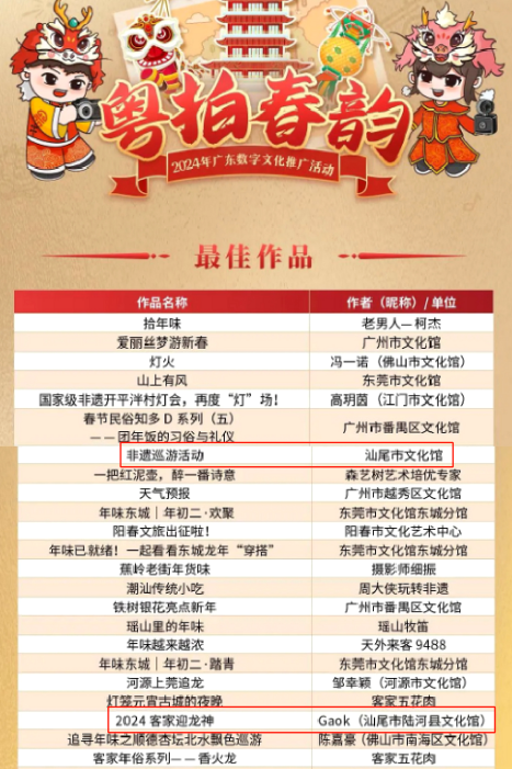 其中,我市共有兩件短視頻精品上榜,憑借其出彩的主題、創(chuàng)意、拍攝技巧及情感表達等,從全省近500條優(yōu)秀短視頻作品中脫穎而出!他們分別是汕尾市文化館的《非遺巡游活動》和汕尾市陸河縣文化館的《2024客家迎龍神》。