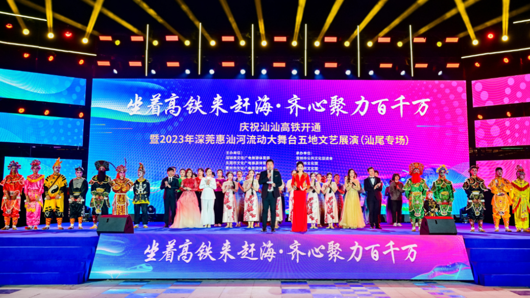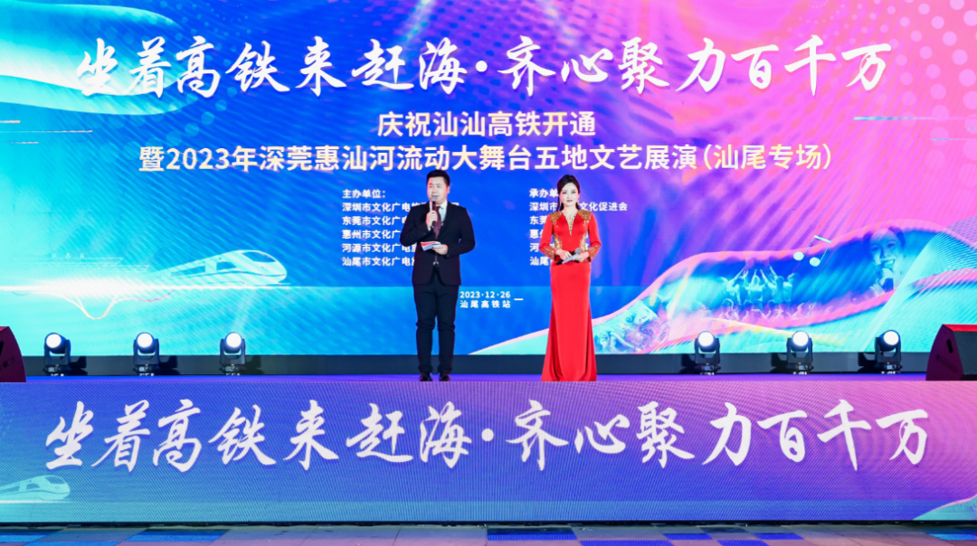 為深入實(shí)施“百千萬高質(zhì)量發(fā)展工程”,汕尾人民翹首以盼的“汕汕高鐵”開通之際,12月26日晚,汕尾市文化廣電旅游體育局在高鐵站站前廣場舉辦了“慶祝汕汕高鐵開通暨2023年深莞惠汕河流動(dòng)大舞臺(tái)五地文藝展演(汕尾專場)”,活動(dòng)以“坐著高鐵來趕海 齊心聚力百千萬”為主題,包括來自深圳、東莞、惠州、河源以及我市的歌舞雜技、戲曲器樂等十余個(gè)節(jié)目輪番上演,五地文藝工作者的盛裝出演為現(xiàn)場觀眾捧上一場精彩紛呈的文化盛宴。