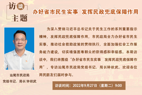 訪談簡介:為深入貫徹習(xí)近平總書記關(guān)于民生工作的系列重要指示精神,發(fā)揮民政兜底保障作用,市民政局全力辦好省市民生實(shí)事,推動(dòng)社會(huì)救助政策的貫徹執(zhí)行,全面加強(qiáng)社會(huì)工作服務(wù)能力建設(shè),切實(shí)增強(qiáng)困難群眾的獲得感和幸福感。本期訪談中,我們將圍繞“辦好省市民生實(shí)事 發(fā)揮民政兜底保障作用”,專訪汕尾市民政局黨組書記、局長鐘秋武。歡迎各位網(wǎng)民朋友們屆時(shí)參與。