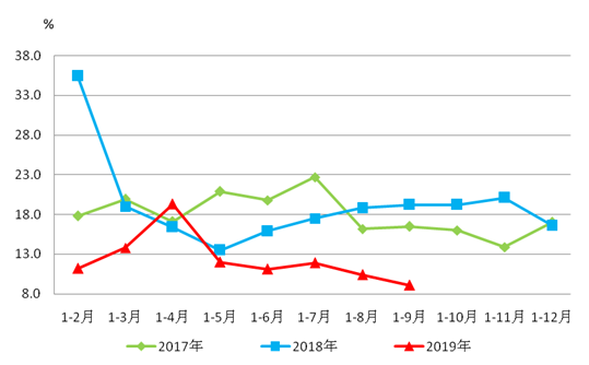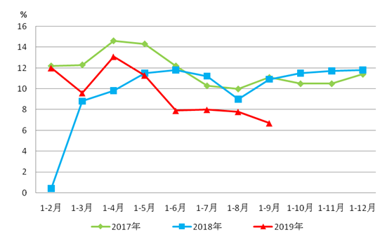 圖2 2017年-2019年前三季度汕尾固定資產(chǎn)投資增速曲線圖