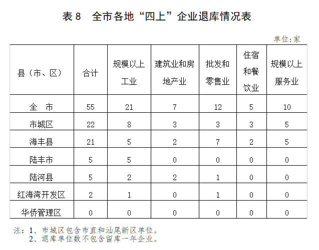 從地區(qū)分類看,市城區(qū)和海豐縣退出單位較多。全市退出“四上”企業(yè)單位中,市城區(qū)和海豐縣退出單位總數(shù)較多,都超過(guò)20家,共計(jì)43家,占全市所有退出單位的78.2%。其中,市城區(qū)退出單位22家,占40.0%;海豐縣退出單位21家,占38.2%。其他地區(qū)退出單位較少,其中陸豐市退出單位5家,占9.1%;陸河縣退出單位5家,占9.1%;紅海灣開(kāi)發(fā)區(qū)退出單位2家,占3.6%。(詳見(jiàn)表8)