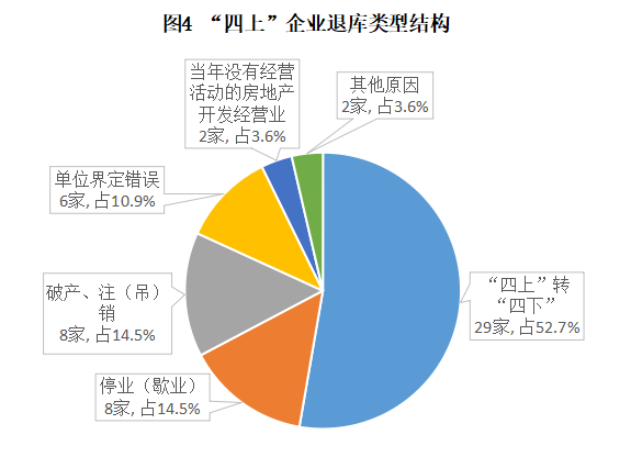 從退庫(kù)類型看,“四上”轉(zhuǎn)“四下”居多。全市退出“四上”企業(yè)單位中,“四上”轉(zhuǎn)“四下”的有29家,占整個(gè)退出單位數(shù)的52.7%;停業(yè)(歇業(yè))的單位8家,占14.5%;破產(chǎn)、注(吊)銷企業(yè)的單位8家,占14.5%;單位界定錯(cuò)誤的單位6家,占10.9%;當(dāng)年沒(méi)有經(jīng)營(yíng)活動(dòng)的房地產(chǎn)開(kāi)發(fā)經(jīng)營(yíng)業(yè)單位2家,占3.6%;因被法院查封等其他原因退出的單位2家,占3.6%。(詳見(jiàn)圖4)