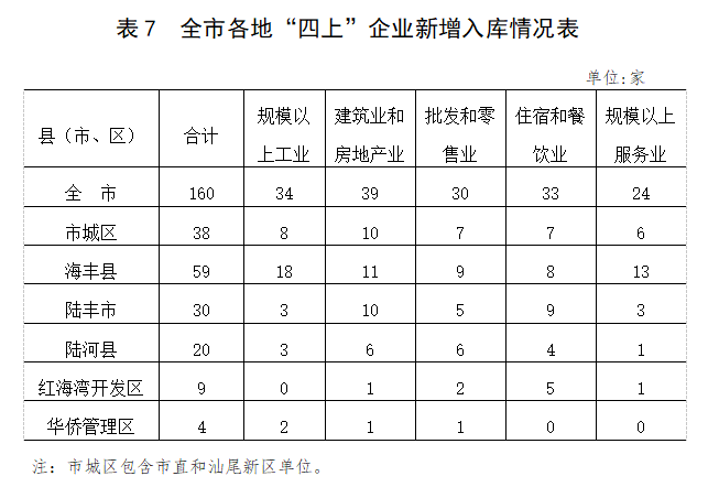 從地區(qū)分類看,海豐縣新增入庫(kù)“四上”企業(yè)最多。全市新增入庫(kù)“四上”企業(yè)單位中,海豐縣新增單位最多,達(dá)到59家,占36.9%;市城區(qū)38家,占23.8%;陸豐市30家,占18.8%;陸河縣20家,占12.5%;紅海灣開(kāi)發(fā)區(qū)9家,占5.6%;華僑管理區(qū)4家,占2.5%。(詳見(jiàn)表7)