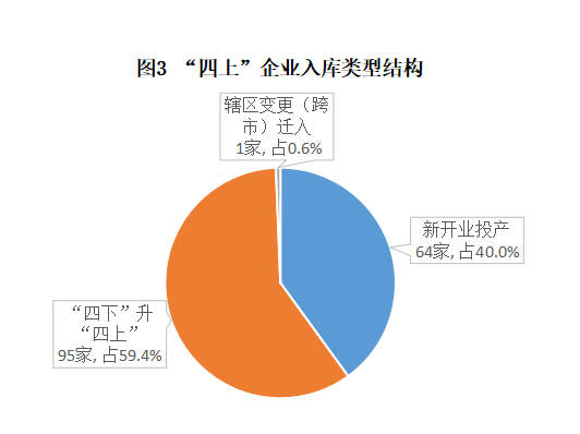 從入庫(kù)類型看,新增入庫(kù)“四下”升“四上”較多。全市新增入庫(kù)“四上”企業(yè)單位中,新開(kāi)業(yè)投產(chǎn)單位64家,比上年增加了19家,增長(zhǎng)42.2%;“四下”升“四上”單位95家,比上年增加了57家,增長(zhǎng)150%;轄區(qū)變更(跨市)遷入單位1家。2020年年度,新增入庫(kù)“四上”企業(yè)中“四下”升“四上”單位占比近六成,達(dá)到59.4%,“小升規(guī)”培育效果明顯。(詳見(jiàn)圖3)