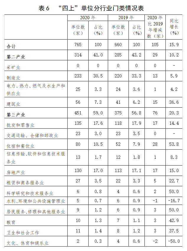 分行業(yè)看,第三產(chǎn)業(yè)占比提升,產(chǎn)業(yè)結(jié)構(gòu)不斷優(yōu)化。2020年,全市第二產(chǎn)業(yè)“四上”企業(yè)單位數(shù)314家,比上年增加29家,增長(zhǎng)10.2%,占全部“四上”企業(yè)單位的41.0%,第三產(chǎn)業(yè)“四上”企業(yè)單位數(shù)451家,比上年增加76家,增長(zhǎng)20.3%,占全部“四上”企業(yè)單位的59.0%,比重同比提高2.2個(gè)百分點(diǎn)。從行業(yè)門類看,單位數(shù)超過(guò)百家規(guī)模的行業(yè)分別是制造業(yè)、批發(fā)和零售業(yè)及房地產(chǎn)業(yè),分別達(dá)到233家、135家和130家,占比分別為30.5%、17.6%和17.0%,三個(gè)行業(yè)單位數(shù)占全部“四上”企業(yè)單位數(shù)超六成,占比達(dá)65.1%。(詳見(jiàn)表6)