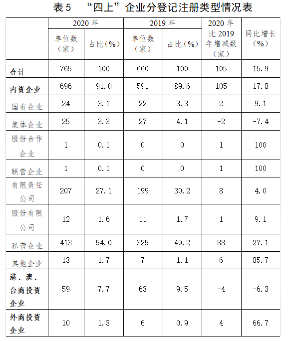 分類型看,內(nèi)資企業(yè)占九成,私營(yíng)經(jīng)濟(jì)發(fā)展活躍。2020年,全市內(nèi)資企業(yè)696家,比上年增加105家,增長(zhǎng)17.8%,占全部“四上”企業(yè)的比重達(dá)91.0%,是“四上”企業(yè)單位的“主力軍”;港澳臺(tái)商投資企業(yè)59家,占7.7%,外商投資企業(yè)10家,占1.3%。在內(nèi)資企業(yè)中,私營(yíng)企業(yè)占主導(dǎo)地位,占全部“四上”企業(yè)的比重達(dá)54.0%。與上年對(duì)比情況看,內(nèi)資企業(yè)、外商投資企業(yè)單位數(shù)增幅明顯,分別增長(zhǎng)了17.8%、66.7%。在內(nèi)資企業(yè)中,私營(yíng)企業(yè)單位發(fā)展活躍,同比增加88家,增長(zhǎng)27.1%,股份合作企業(yè)和聯(lián)營(yíng)企業(yè)單位均實(shí)現(xiàn)“零”的突破,其余注冊(cè)類型除集體企業(yè)出現(xiàn)7.4%的降幅外,均有不同程度的增加。(詳見(jiàn)表5)