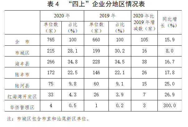 分地區(qū)看,地區(qū)差異明顯,海豐單位數(shù)量最多。2020年,在庫(kù)“四上”企業(yè)數(shù)量占比排名前三位的地區(qū)分別是海豐縣266家(占比34.8%)、市城區(qū)215家(占比28.1%)、陸豐市172家(占比22.5%)。與上年對(duì)比情況看,各縣(市、區(qū))增速除了市城區(qū)外均高于全市15.9%的增速。其中華僑管理區(qū)增長(zhǎng)最快,由上年的僅有1家“四上”企業(yè)增加到了4家,增長(zhǎng)了300%,其他地區(qū)分別是:紅海灣開(kāi)發(fā)區(qū)增長(zhǎng)26.9%、陸河縣增長(zhǎng)25.0%、陸豐市增長(zhǎng)17.8%、海豐縣增長(zhǎng)16.7%、市城區(qū)增長(zhǎng)8.0%。(詳見(jiàn)表4)