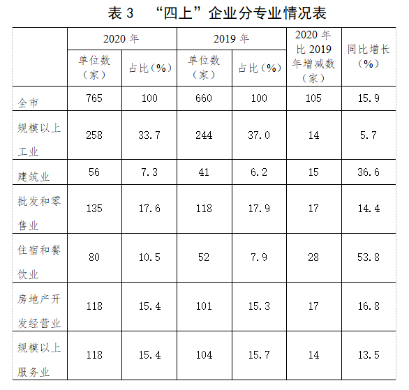 分專業(yè)看,工業(yè)占比最高,住宿餐飲業(yè)增長(zhǎng)最快。2020年,全市規(guī)模以上工業(yè)企業(yè)單位258家,占“四上”企業(yè)總數(shù)的33.7%,單位數(shù)居各專業(yè)榜首;其次分別是批發(fā)和零售業(yè)單位135家,占比17.6%;房地產(chǎn)開(kāi)發(fā)經(jīng)營(yíng)業(yè)單位118家,占比15.4%;規(guī)模以上服務(wù)業(yè)單位118家,占比15.4%;住宿和餐飲業(yè)單位80家,占比10.5%;建筑業(yè)企業(yè)單位56家,占比7.3%(詳見(jiàn)圖2)。與上年對(duì)比情況看,住宿和餐飲業(yè)增長(zhǎng)最快,同比增長(zhǎng)53.8%,遠(yuǎn)超全市15.9%的增速,其次分別是建筑業(yè)、房地產(chǎn)開(kāi)發(fā)經(jīng)營(yíng)業(yè)、批發(fā)和零售業(yè)、規(guī)模以上服務(wù)業(yè)、規(guī)模以上工業(yè),增速分別是36.6%、16.8%、14.4%、13.5%、5.7%。(詳見(jiàn)表3)