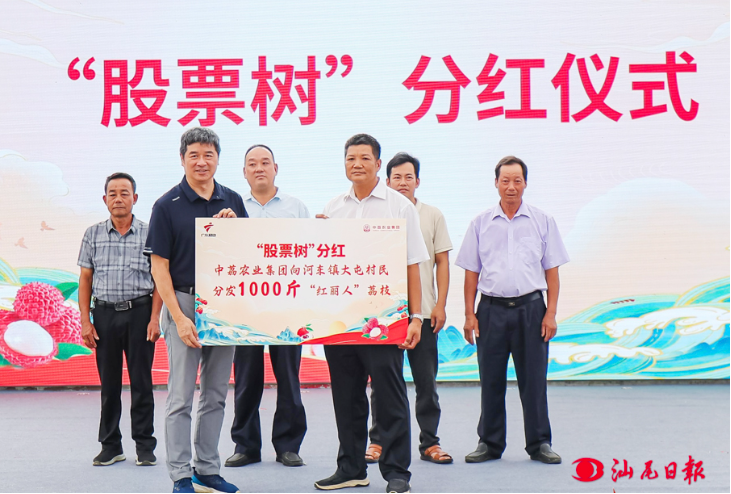 活動中亮點頻出,精彩不斷,“紅麗人”“遲美人”兩大荔枝新品正式發(fā)布;文藝工作者、非遺傳承人等獲授“陸豐荔枝文化推廣大使”稱號;荔枝出口基地揭牌。其中,“股票樹”分紅儀式尤為引人注目,會上河東鎮(zhèn)大屯村村民作為首批受益者現(xiàn)場領(lǐng)取分紅,還公布了升級版的“股票樹?2.0”模式。該模式通過資源整合與風險共擔,進一步拓寬了農(nóng)民增收渠道。“盼了3年,今天收到‘股票樹’的分紅很開心,看到大家都在推廣我們種的荔枝,心里很激動,希望日子能越來越好?!焙訓|鎮(zhèn)大屯村村民話語難掩喜悅之情。
