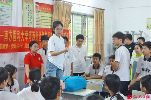為將醫(yī)學知識轉化為守護健康的實際力量,提升師生和居民對常見病防治的認知及應對突發(fā)狀況的急救技能,服務隊聯(lián)合河西街道社區(qū)衛(wèi)生服務中心開展“三維健康賦能”行動。在河西中學,服務隊以圖文并茂的講解和“乒乓球吹水杯”闖關游戲,普及痛風防治知識。期間,服務隊還與衛(wèi)生中心醫(yī)生組成“雙導師”,通過標準化演示和“情境再現(xiàn)”微劇場,教授心肺復蘇和創(chuàng)傷包扎等急救技能,并從專業(yè)角度著重強調了“黃金4分鐘”。隨后一對一指導實操,確保學生真正掌握“救命技能”。