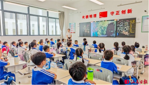 當(dāng)天升旗儀式后,學(xué)生們回到了教室,在老師的帶領(lǐng)下開啟“開學(xué)第一課”。“學(xué)校此次開展的第一節(jié)課是融合校史教育的國情班隊課。”據(jù)該校負(fù)責(zé)人介紹,該?!伴_學(xué)第一課”旨在通過系列化、課程化、活動化的國情教育,引導(dǎo)學(xué)生樹立正確國家觀、歷史觀、民族觀、文化觀,將愛國情、強國志、報國行融入學(xué)生學(xué)習(xí)和成長中,打好中國底色,培育時代新人。