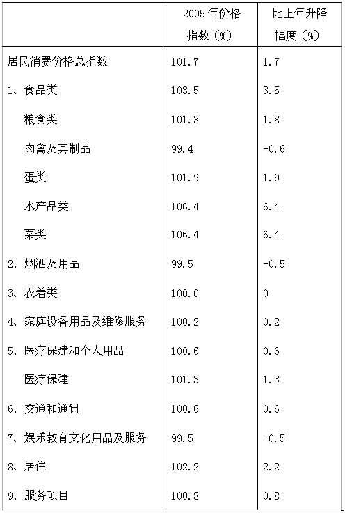 市區(qū)消費(fèi)價格總指數(shù)上升1.7%,其中食品上升3.5%,醫(yī)療保健上升1.3%,居住上升2.2%,家庭設(shè)備用品及維修服務(wù)上升0.2%,交通上升3.4%,通訊下降2%。