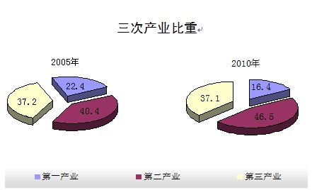 調(diào)整優(yōu)化,三次產(chǎn)業(yè)結(jié)構(gòu)由2009年的17.3:44.5:38.2調(diào)整為16.4:46.5:37.1。