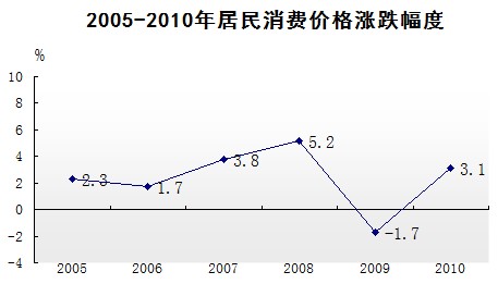 2010年,隨著食品價(jià)格的上漲及原油、有色金屬、棉花、糧食等國(guó)際大宗商品價(jià)格持續(xù)走強(qiáng),總體物價(jià)水平呈逐步攀升的態(tài)勢(shì)。全年累計(jì),居民消費(fèi)價(jià)格總指數(shù)上漲3.1%,其中消費(fèi)品價(jià)格指數(shù)上漲3.9%。居民消費(fèi)價(jià)格中,食品價(jià)格上升6.6%,其中,菜類和水產(chǎn)品價(jià)格分別上漲20.4%和7.2%;居住類價(jià)格上漲5.8%,其中水、電、燃料價(jià)格上漲10.0%。