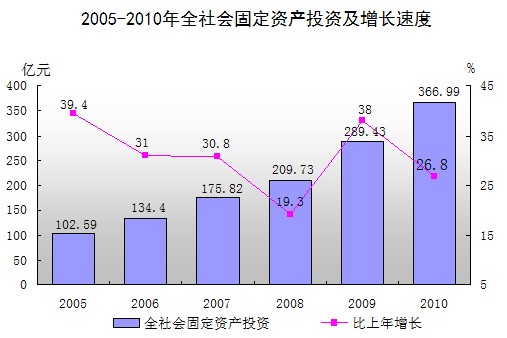 投資規(guī)模繼續(xù)擴(kuò)大。2010年,全市完成全社會(huì)固定資產(chǎn)投資366.99億元,同比增長(zhǎng)26.8%。其中,城鎮(zhèn)以上固定資產(chǎn)投資300.33億元,增長(zhǎng)29.4%;農(nóng)村固定資產(chǎn)投資66.65億元 ,增長(zhǎng)16.4%。