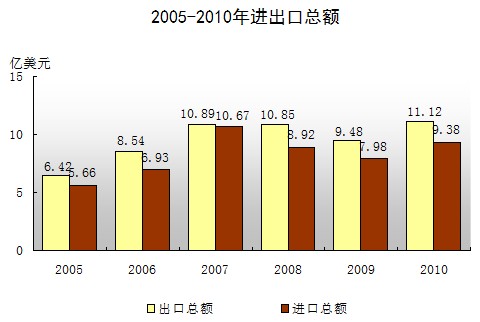 全年累計(jì)新簽合同協(xié)議24宗,合同利用外商直接投資5.27億美元,增長(zhǎng)22.4%,實(shí)際吸收外商直接資2.85億美元,增長(zhǎng)3.1%。全年完成外貿(mào)進(jìn)出口總值20.50億美元,比上年增長(zhǎng)17.4%,其中出口總值11.12億美元,比上年增長(zhǎng)17.3%。 從貿(mào)易方式看,一般貿(mào)易出口1.85億美元,增長(zhǎng)49.9%;加工貿(mào)易出口9.26億美元, 增長(zhǎng)12.2%。從經(jīng)營(yíng)主體看,“三資”企業(yè)占主導(dǎo)地位,累計(jì)出口8.98億美元,增長(zhǎng)19.8%,占80.8%。