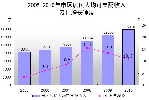 市區(qū)居民人均可支配收入13916元,增長(zhǎng)10.8%,人均消費(fèi)支出10013元,增長(zhǎng)14.6%,市區(qū)居民家庭恩格爾系數(shù)為44.1%,比上年下降0.2個(gè)百分點(diǎn)。據(jù)勞動(dòng)工資統(tǒng)計(jì),全市在崗職工工資總額38.15億元,比上年增長(zhǎng)19.8%,在崗職工人均工資25501元,增長(zhǎng)9.7%。