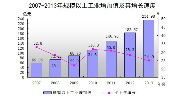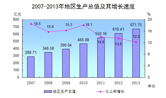 初步核算,2013年全市實(shí)現(xiàn)地區(qū)生產(chǎn)總值(GDP)671.75億元,比上年增長(zhǎng)12.2%。其中,第一產(chǎn)業(yè)增加值108.26億元,增長(zhǎng)3.9%,對(duì)GDP增長(zhǎng)的貢獻(xiàn)率為4.6%;第二產(chǎn)業(yè)增加值315.69億元,增長(zhǎng)18.3%,對(duì)GDP增長(zhǎng)的貢獻(xiàn)率為75.9%;第三產(chǎn)業(yè)增加值247.80億元,增長(zhǎng)6.9%,對(duì)GDP增長(zhǎng)的貢獻(xiàn)率為19.5%。三次產(chǎn)業(yè)結(jié)構(gòu)為16.1:47.0:36.9。全市人均地區(qū)生產(chǎn)總值達(dá)到22560元(按年平均匯率折合3643美元),增長(zhǎng)11.7%。