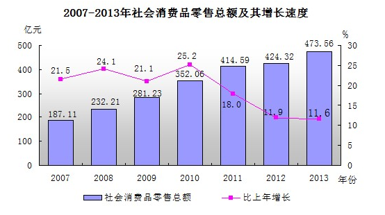 全年完成社會(huì)消費(fèi)品零售總額473.56億元,同比增長(zhǎng)11.6%。分行業(yè)看,批發(fā)零售貿(mào)易業(yè)零售額422.94億元,增長(zhǎng)11.6%;住宿和餐飲業(yè)零售額50.62億元,增長(zhǎng)11.9%。分地域看,縣及縣以上消費(fèi)品零售額336.90億元,增長(zhǎng)12.0%;縣以下消費(fèi)品零售額136.66億元,增長(zhǎng)10.7%。