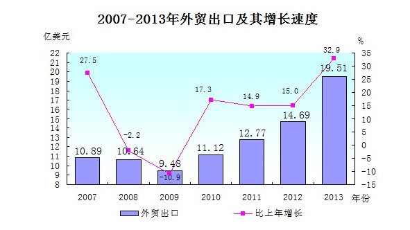 全年完成進(jìn)出口總額41.74億美元,比上年增長(zhǎng)46.8%。其中,進(jìn)口總額22.23億美元,增長(zhǎng)61.8%;出口總額19.51億美元,增長(zhǎng)32.9%。從出口方式看,一般貿(mào)易出口2.29億美元,增長(zhǎng)9.2%;加工貿(mào)易出口17.22億美元,增長(zhǎng)36.8%。