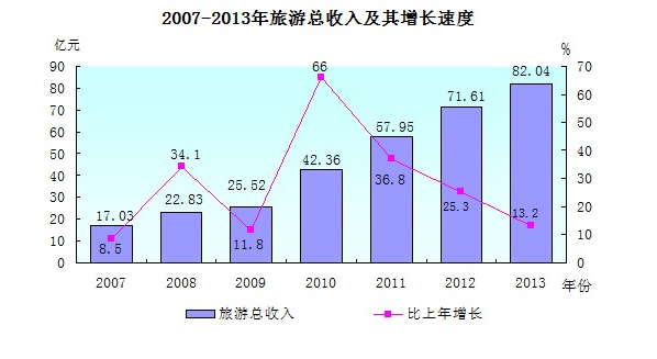 全年接待過(guò)夜游客 585.26萬(wàn)人次,增長(zhǎng)12.0%,其中入境旅游人數(shù)3.63萬(wàn)人次,下降16.9%。在入境人數(shù)中,接待港澳臺(tái)同胞3.62萬(wàn)人次,外國(guó)人53人次。全市旅游總收入82.04億元,其中國(guó)內(nèi)收入81.31億元,分別增長(zhǎng)13.2%和13.6%;國(guó)際旅游外匯收入1180.02萬(wàn)美元,減少16.8%。