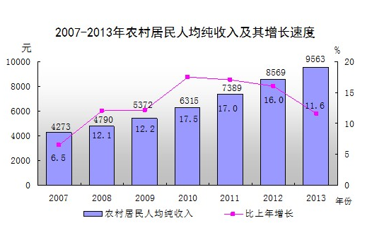 全年農(nóng)村居民人均純收入9563元,比上年增長(zhǎng)11.6%;農(nóng)民人均消費(fèi)支出7807元,增長(zhǎng)9.4%;其中,教育文化娛樂(lè)服務(wù)支出465元,增長(zhǎng)13.9%。農(nóng)村居民家庭恩格爾系數(shù)47.1%,比上年下降0.4個(gè)百分點(diǎn)。