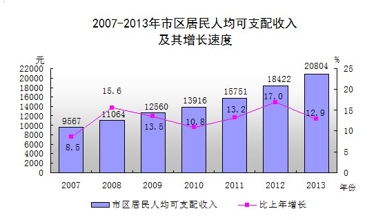 全年市區(qū)居民人均可支配收入20804元,增長(zhǎng)12.9%;人均消費(fèi)支出15323元,增長(zhǎng)11.0%;其中,教育文化娛樂(lè)服務(wù)支出1564元,增長(zhǎng)7.8%。市區(qū)居民家庭恩格爾系數(shù)為42.7%,比上年下降0.7個(gè)百分點(diǎn)。