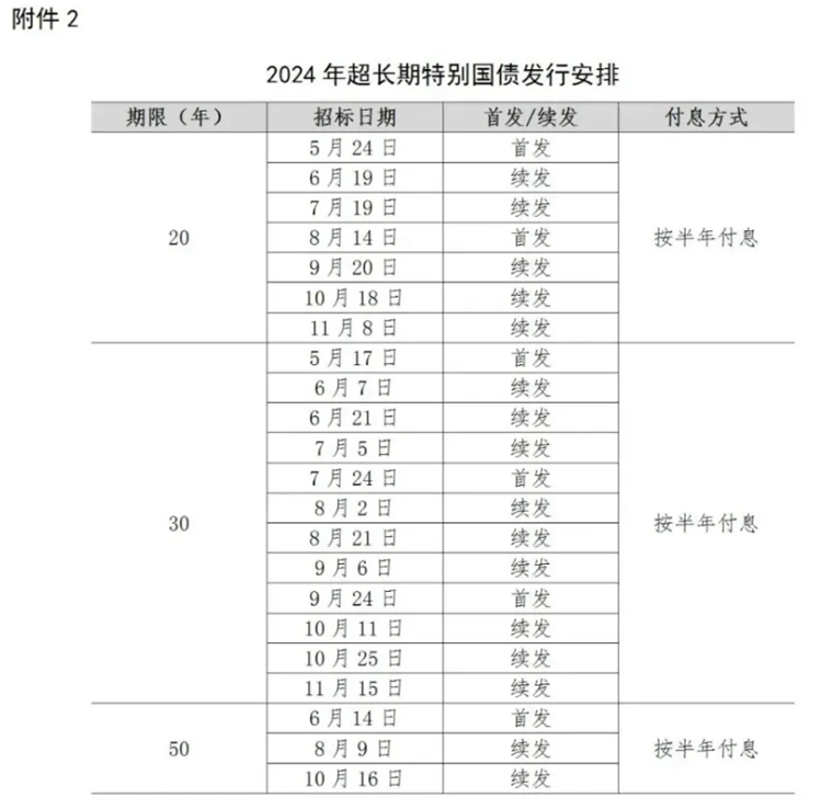 發(fā)行安排已公布:今年先發(fā)行1萬億元,期限分別為20年、30年、50年。30年期超長期特別國債已于5月17日首發(fā),6月7日續(xù)發(fā);20年期超長期特別國債已于5月24日首發(fā);50年期超長期特別國債將于6月14日首發(fā)。