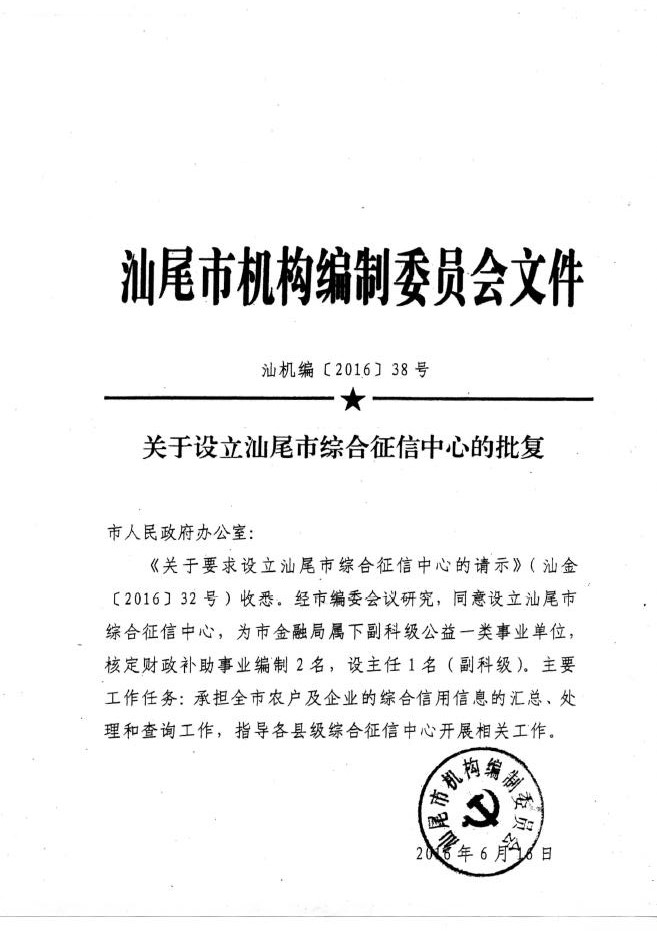 關(guān)于設(shè)立汕尾市綜合征信中心的批復(fù)