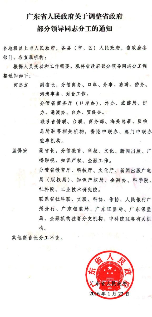 廣東省人民政府關于調整省政府部分領導同志分工的通知