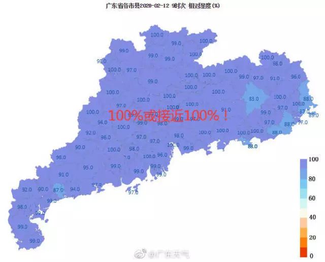 近期隨著暖濕氣流控制廣東,增溫增濕,今日上午9時(shí),全省各地相對(duì)濕度基本超過90%,部分地市甚至達(dá)到100%。