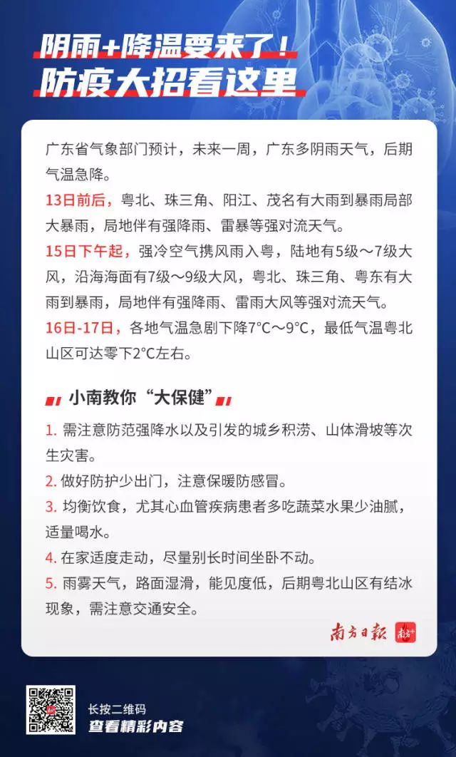 而自15日下午起,強(qiáng)冷空氣將攜風(fēng)雨自北向南影響廣東,陸地將出現(xiàn)有5級(jí)-7級(jí)大風(fēng),沿海海面有7級(jí)-9級(jí)大風(fēng),粵北和珠三角北部市縣有大雨到暴雨局部大暴雨,局地伴有強(qiáng)降雨、雷雨大風(fēng)、冰雹等強(qiáng)對(duì)流天氣。 待到16日-17日,受冷空氣影響,各地氣溫將急劇下降7℃-9℃,中北部山區(qū)市縣有低溫霜(冰)凍(過程最低氣溫粵北高寒山區(qū)可達(dá)零下3℃左右)。 廣州市區(qū),13日,大雨到暴雨,16℃-20℃;14日,中雨,17-22℃;15日,大雨,17℃-22℃;16日,中雨轉(zhuǎn)多云,10℃-18℃。 總結(jié)就是,本周將出現(xiàn)較強(qiáng)烈的天氣變化:降溫降雨,并伴隨強(qiáng)對(duì)流天氣。