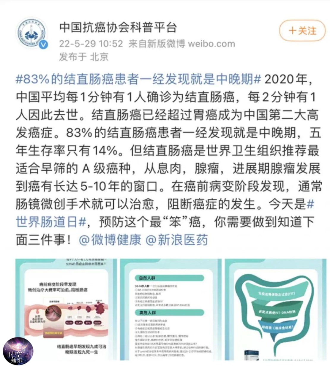 結直腸癌已經(jīng)在中國上升為排名第二的高發(fā)癌癥,罹患這種癌癥一經(jīng)發(fā)現(xiàn),有83%屬于中晚期,也就是二期或三期,5年生存率只有14%,全國每年有28萬多人因此癌癥而喪生,相當每小時32人,每天約780余人死于結直腸癌。