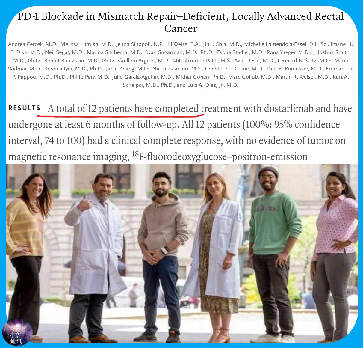 這就是6月5日《新英格蘭醫(yī)學雜志》上發(fā)表的一項重要研究成果,即世界排名老九的制藥公司葛蘭素史克制造出一款抗癌神藥,名為多斯塔利單抗的免疫治療藥物,英文名為dostarlimab,竟讓12位直腸癌患者在沒有動手術和放化療的前提下,全部痊愈!