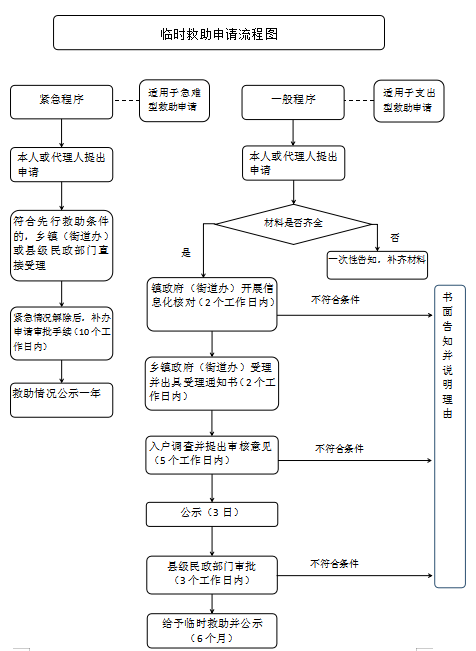 《細(xì)則》將臨時救助程序分為一般程序與緊急程序。其中,支出型對象適用于一般程序,可在戶籍所在地或經(jīng)常居住地的鎮(zhèn)人民政府(街道辦事處)社會救助綜合服務(wù)窗口提出臨時救助申請;急難型對象適用于緊急程序,戶籍所在地、經(jīng)常居住地或急難發(fā)生地縣(市、區(qū))民政部門、鎮(zhèn)人民政府(街道辦事處)依申請或依有關(guān)部門、社會組織、公民個人報告的救助線索,均可直接受理?!都?xì)則》還進(jìn)一步細(xì)化了一般程序中申請、信息化核對、入戶調(diào)查、民主評議、審核、審批決定、公示等具體流程,并對緊急程序中簡化申請環(huán)節(jié)、實施先行救助、提供申請材料、進(jìn)行救助公示等工作內(nèi)容進(jìn)行了規(guī)定。