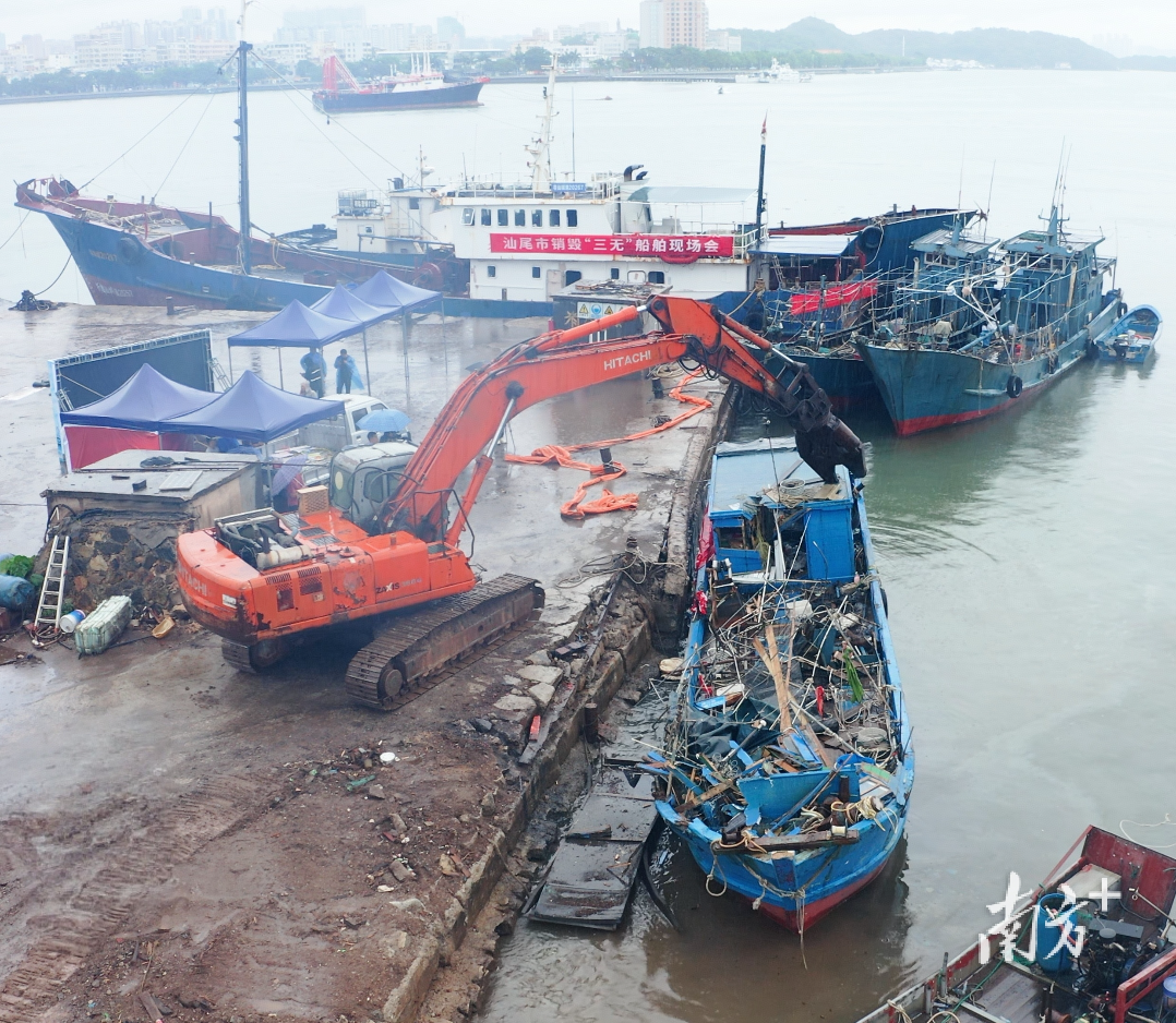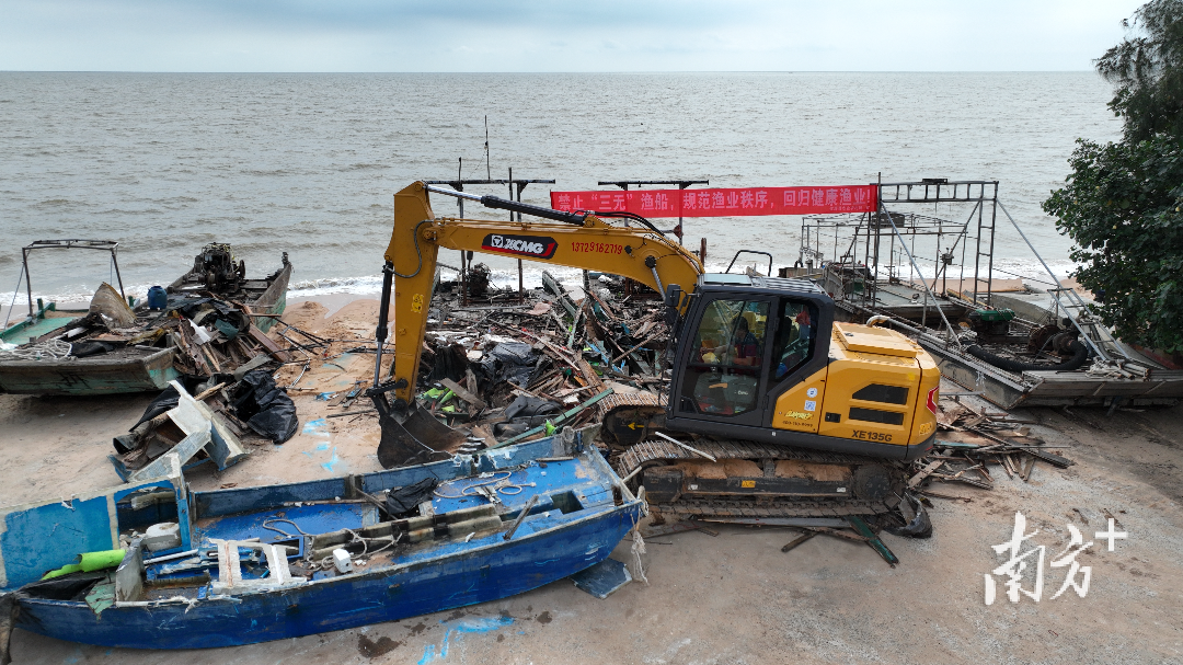 現(xiàn)場拆解號令響起后,工作人員利用大型挖掘機,將25艘涉漁“三無”船舶逐一拆解銷毀,起到了“拆解一批、震懾一片”的良好效果。