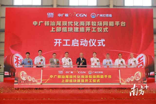 12月10日上午11時許,位于江門市新會區(qū)崖門鎮(zhèn)的廣州打撈局新會基地?zé)狒[非常,汕尾市陸豐后湖國內(nèi)首個臺風(fēng)無掩護(hù)海域的樁基桁架式“風(fēng)漁融合”海洋牧場項目的現(xiàn)代化海洋牧場網(wǎng)箱平臺上部組塊建造在這里舉行開工啟動儀式,該組塊建成后計劃安裝于中廣核汕尾后湖風(fēng)電場西區(qū)中心區(qū)域。