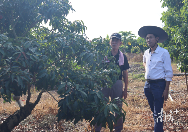 劉成明和崔保國在荔園內(nèi)查看荔枝樹生長情況。 南方+ 郭楊陽 拍攝